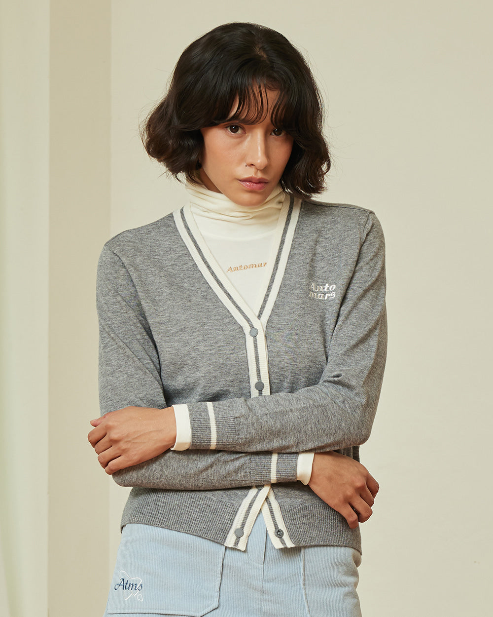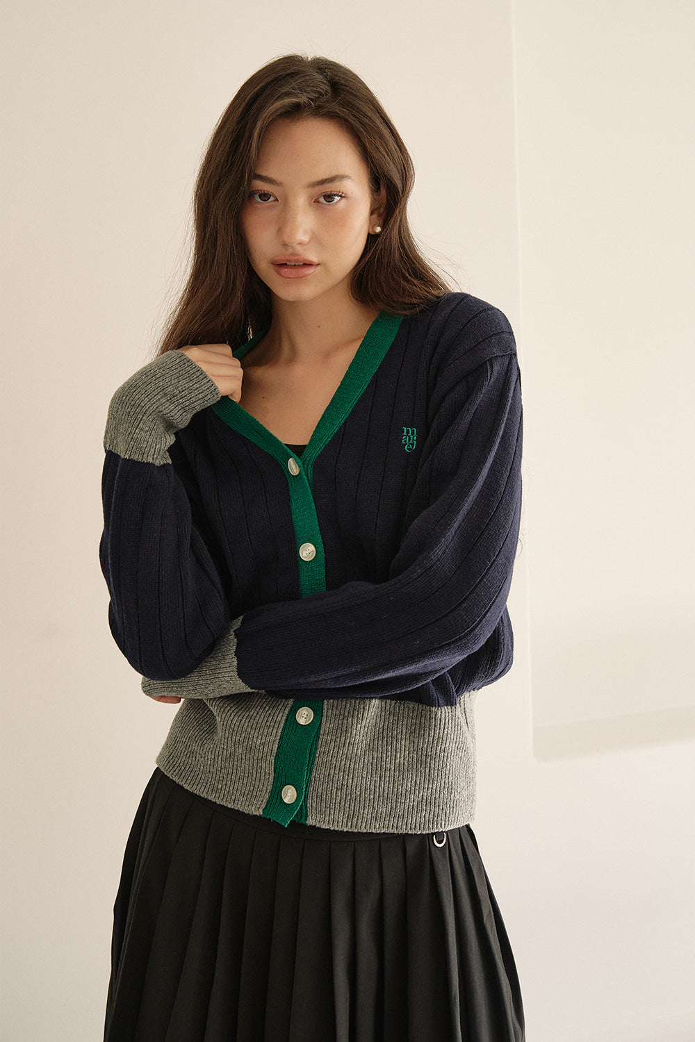 配色カラーが目を引く、Vネックデザインのニットカーディガンです。