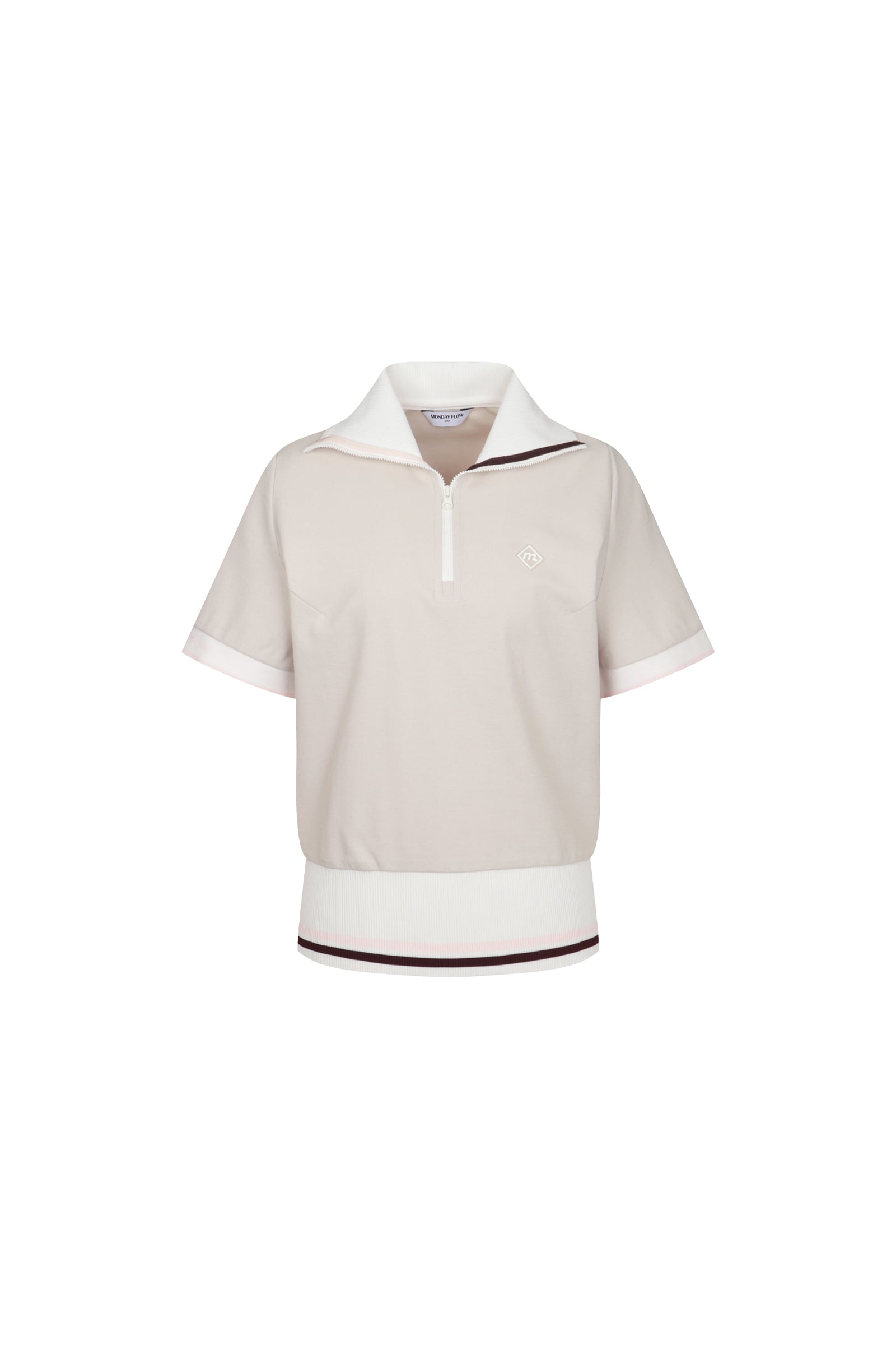 ワイドカラー ハーフジップアップ トップ(ベージュ)