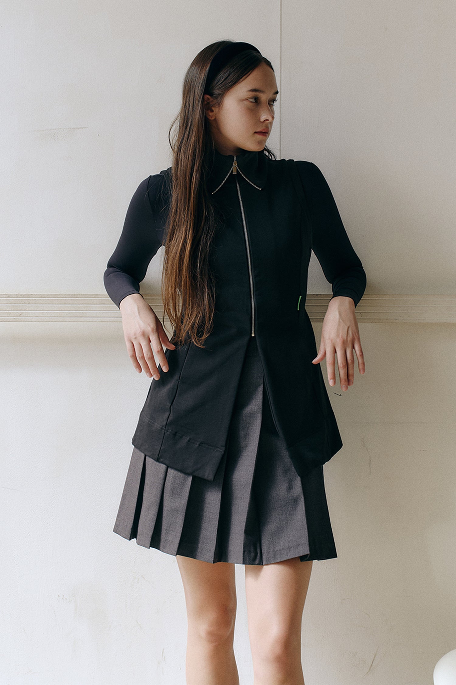 ビッグカラーを活かしたデザインで、タートルネック風とセーラーカラー風の2通りの着こなしが楽しめるベルト付きベストです。