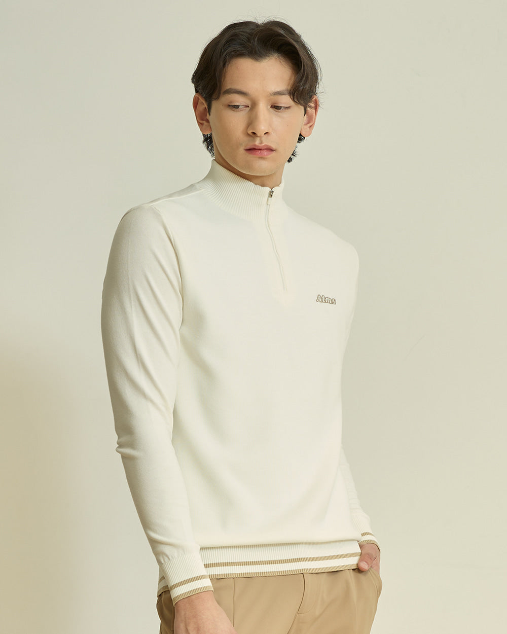 裾と袖口の配色カラーがアクセントになった、ハーフジップタイプのニットです。