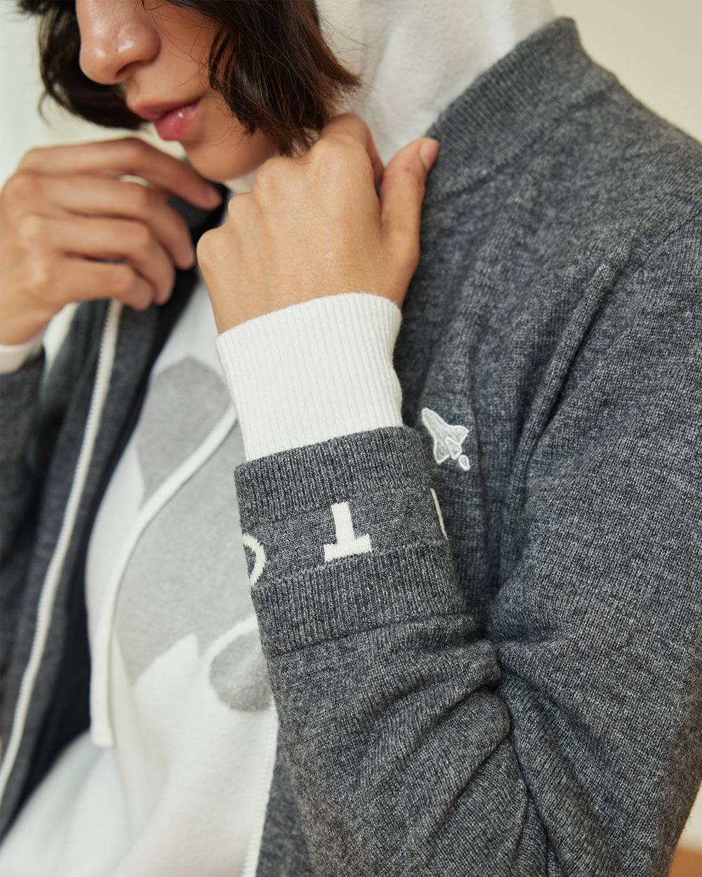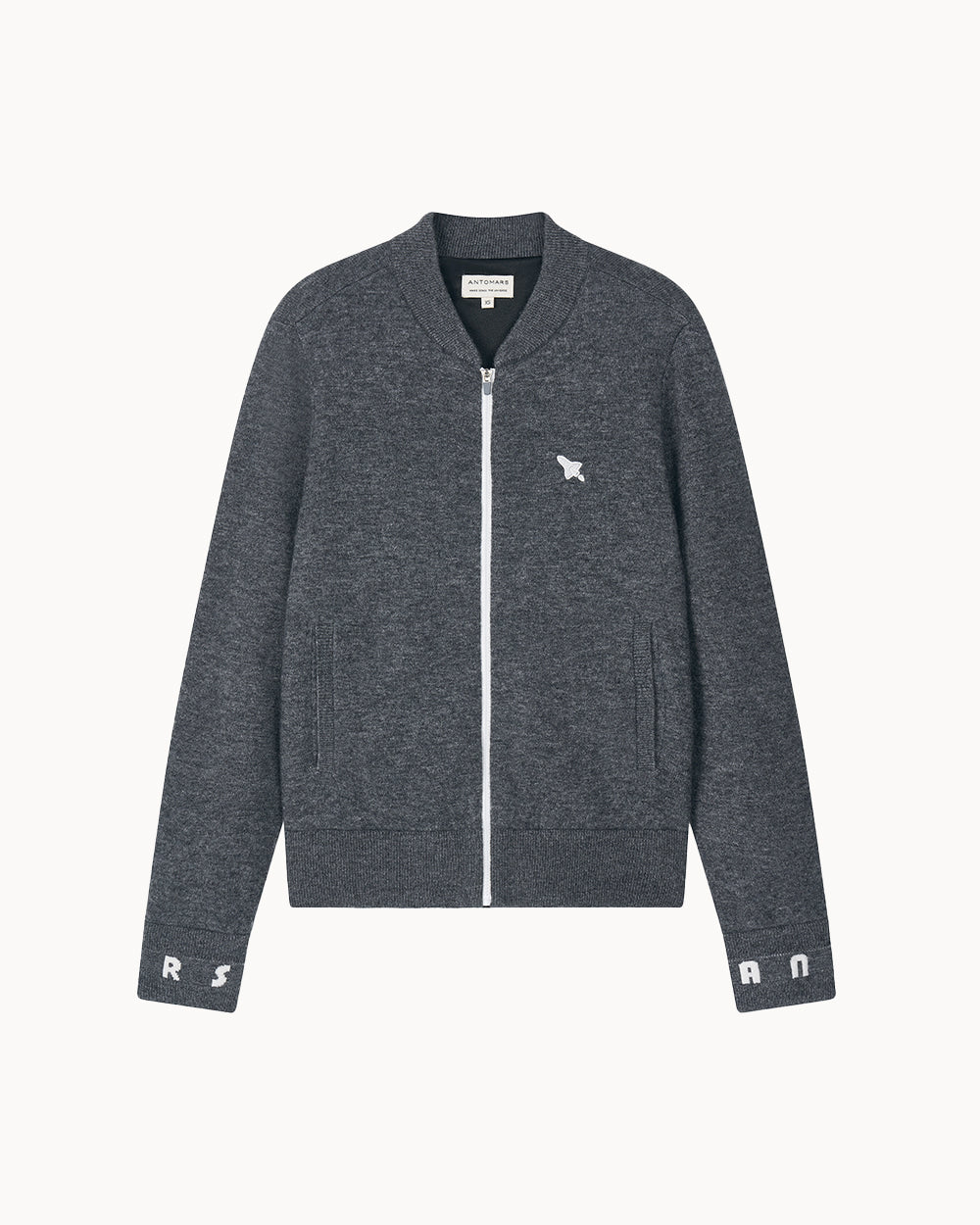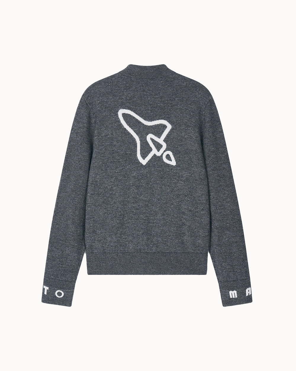 袖口のANTOMARSレタリングロゴと、背中のスペースシップロゴがポイントのジップアップニットカーディガンです。
