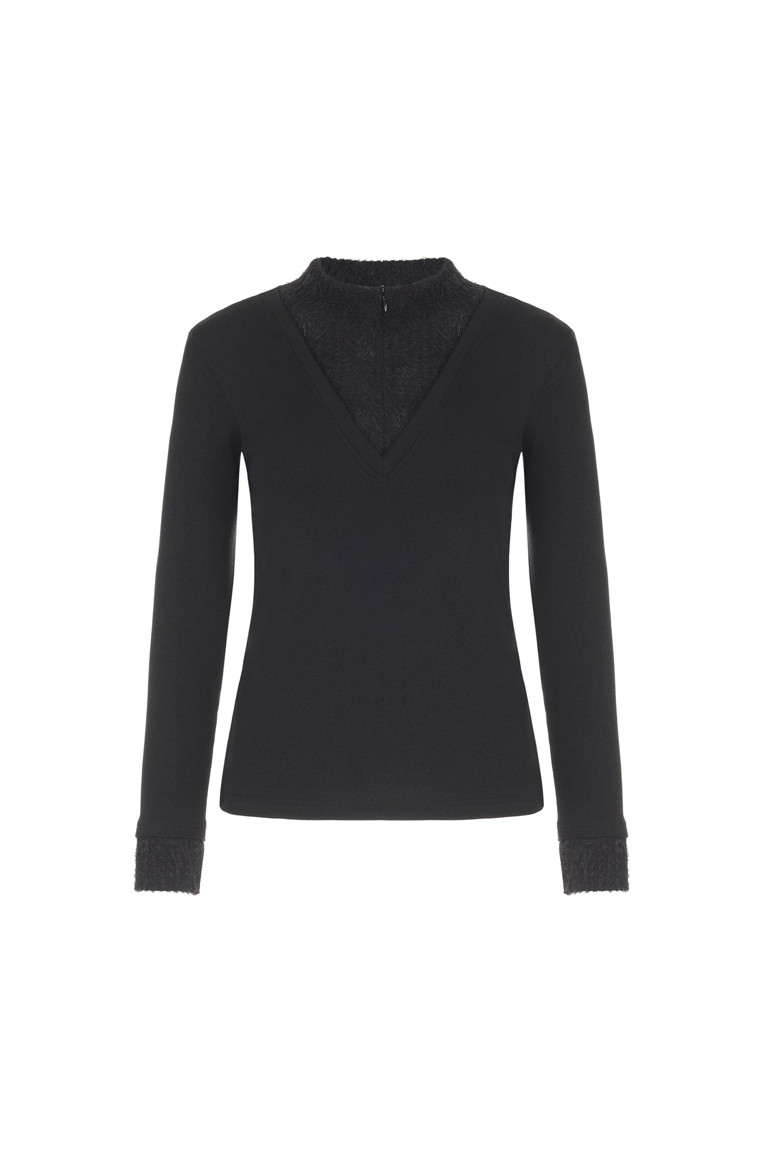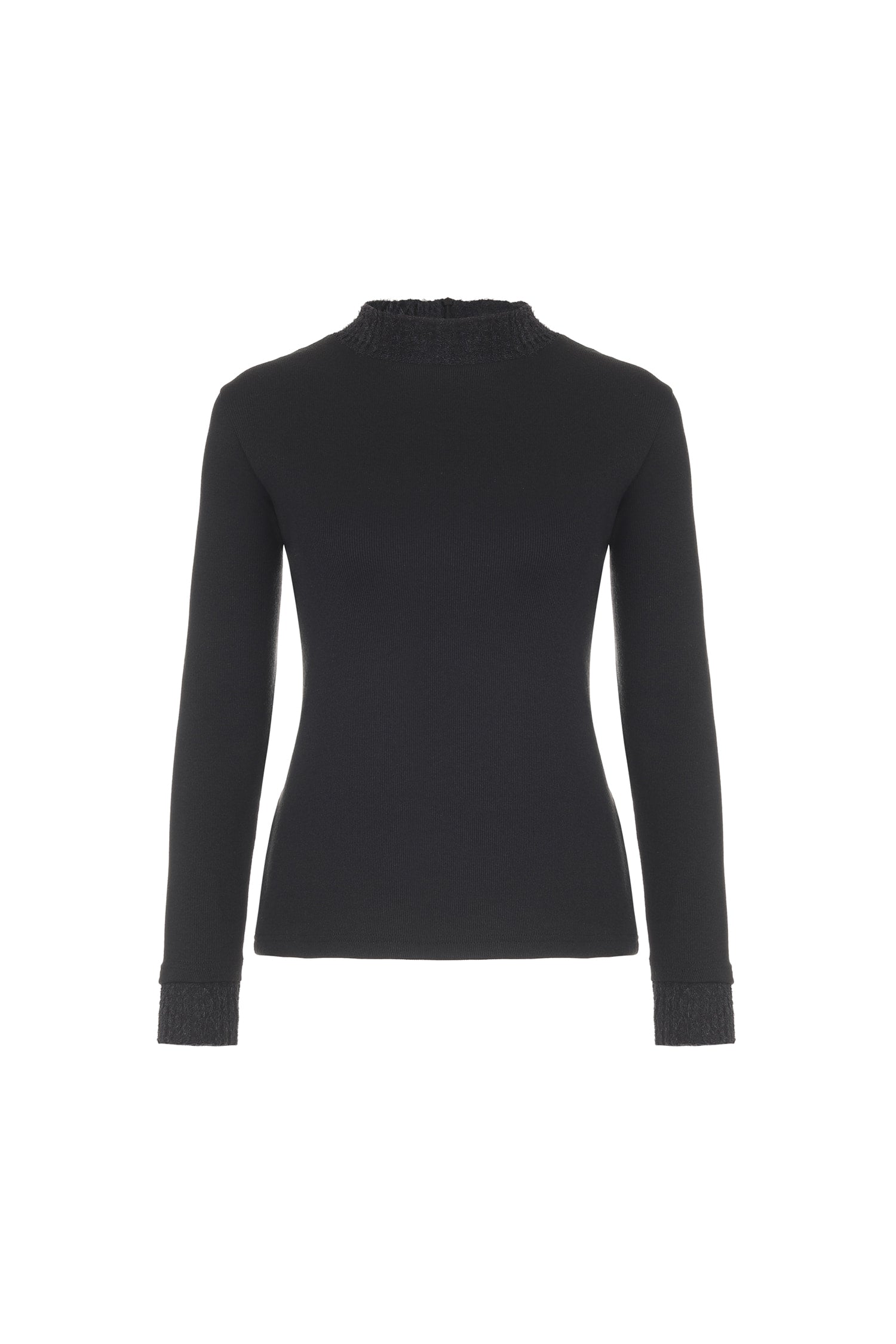 襟元と袖口には柔らかな配色ディテールを施し、シンプルながらもさりげないアクセントをプラスしています。
