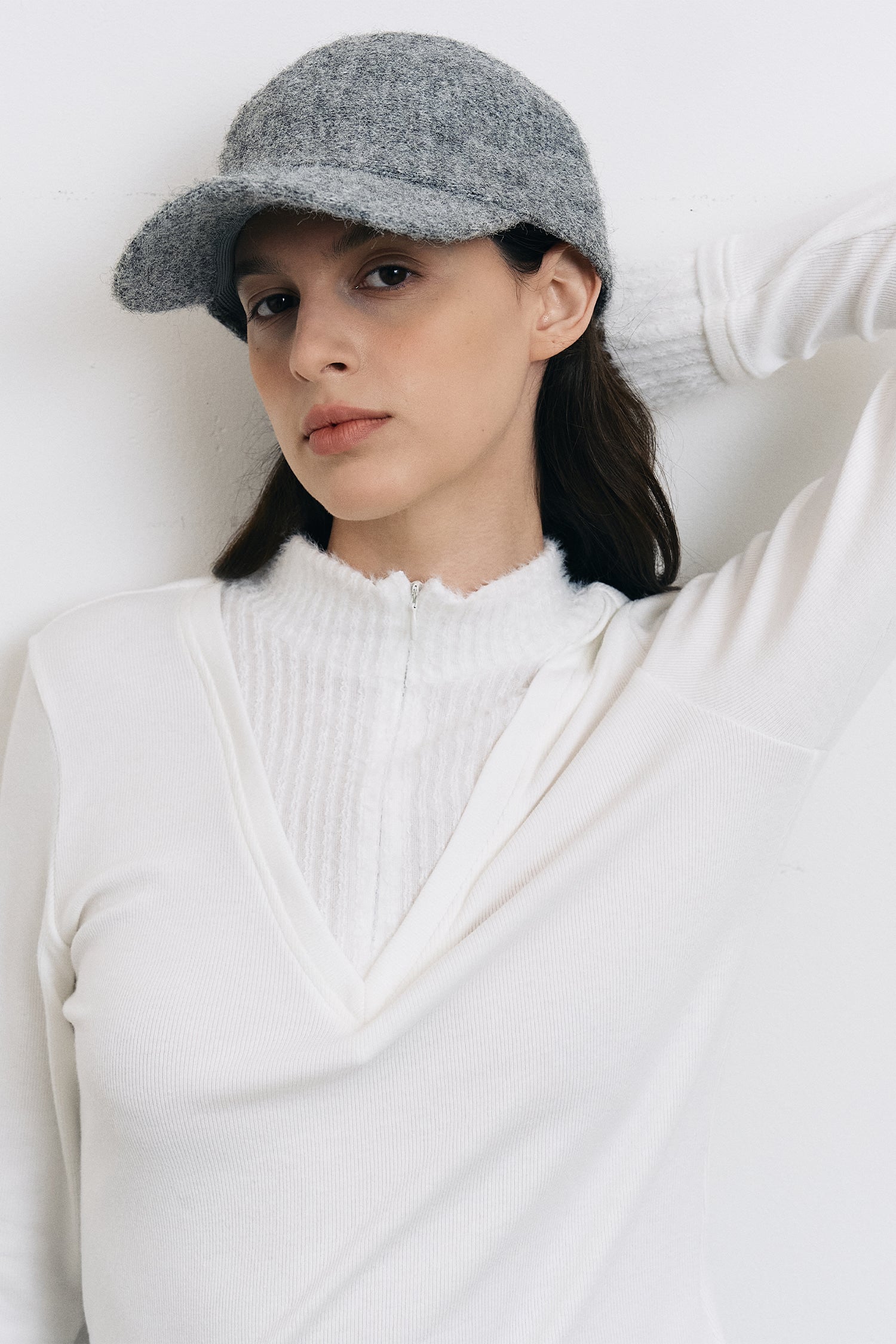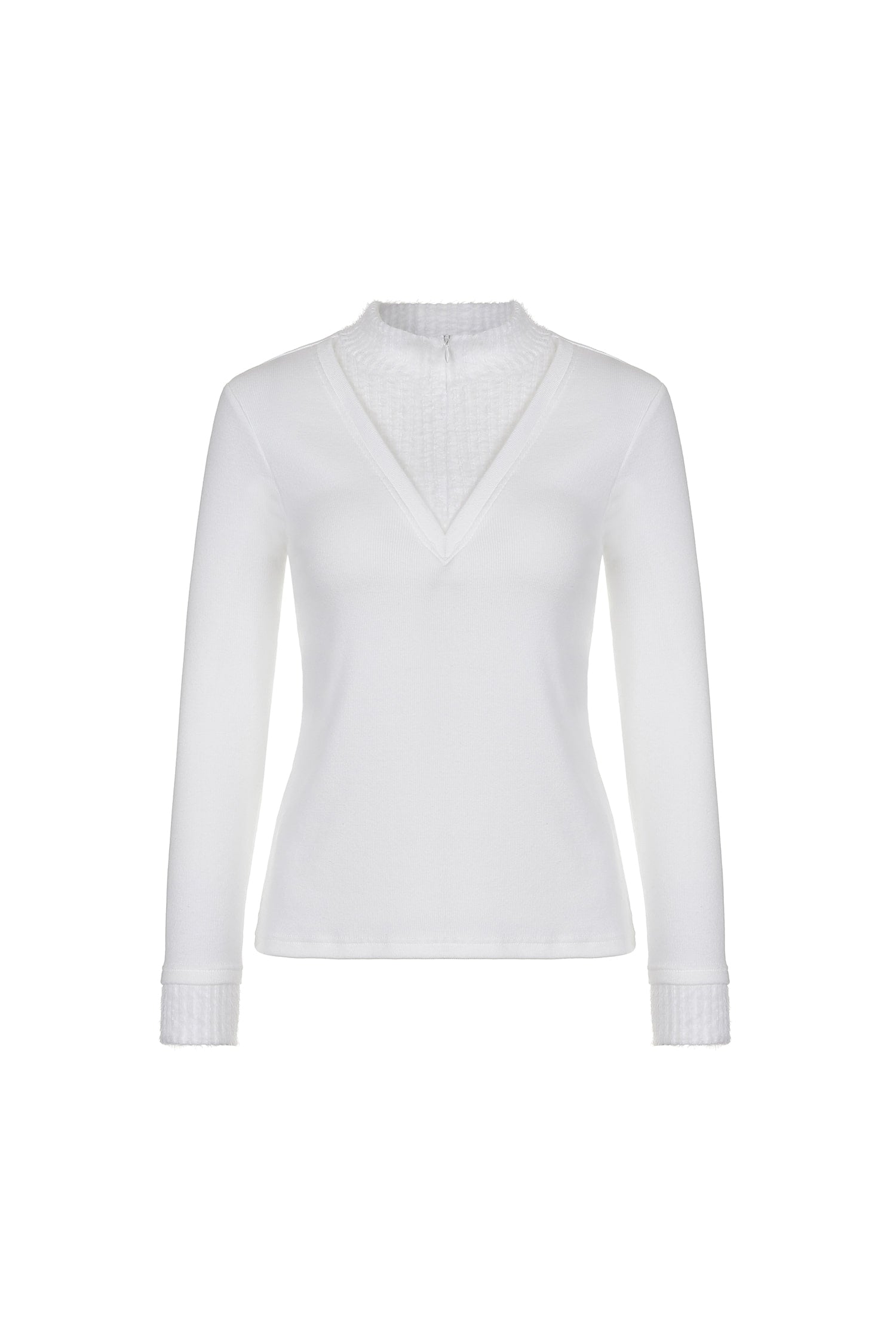 襟元と袖口には柔らかな配色ディテールを施し、シンプルながらもさりげないアクセントをプラスしています。